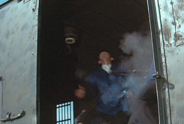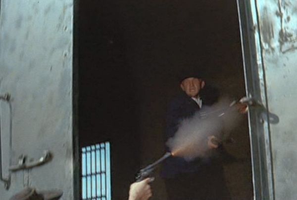 Da öffnet einer die Zugtür und schießt auf den rechten Bahnbediensteten - und der linke fällt aus Sympathie einfach gleich mit um - WOW.